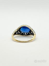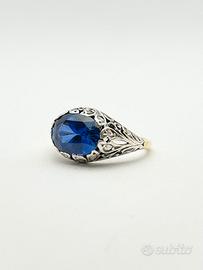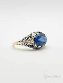 Anello in oro bianco e giallo 18KT (750 ‰) di grammi 4.56 con diamanti naturali taglio rosetta e pietra sintetica, epoca 1920.
