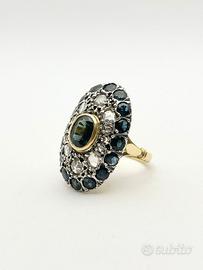Anello in oro bianco e giallo 18KT (750 ‰) di grammi 9.38 impreziosito da diamanti naturali forma tonda e taglio antico e zaffiri naturali taglio sfaccettato, epoca 1950.