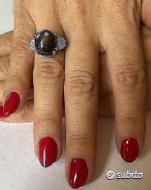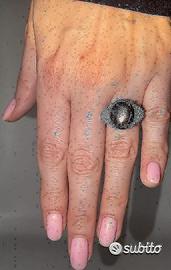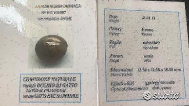 ANELLO IN ORO BIANCO 750°/°° - 18 carati CON DIAMANTI* NATURALI TAGLIO BRILLANTE E CORINDONE NATURALE VARIETA' "OCCHIO DI GATTO", CON EFFETTO GATTEGGIANTE , DI TAGLIO CABOCHON CON ANALISI GEMMOLOGICA DOTT. GIULIO PROVERA (rarità gemmologica) Effetto occhio di gatto In gemmologia, il gatto, anche l'effetto gatteggiamento o occhio di gatto, è un effetto di riflettanza ottica visibile in alcune pietre preziose. Coniato dal francese "oeil de chat", che significa "occhio di gatto", il gatteggiamento deriva dalla struttura fibrosa di un materiale. 10 DIAMANTI ct. : 0,37 colore : G / purezza : VS CORINDONE ct. : 18,01 PESO ANELLO gr. : 10,60 MISURA DEL DITO: 16 1/2 (è possibile cambiare misura dell'anello per qualsiasi informazione contattateci) altre foto richieste via email spedizione con assicurata tramite Poste Italiane