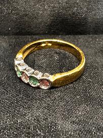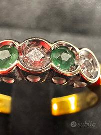 Anello in oro giallo e bianco 18kt con tre diamanti taglio brillante per un totale stimati di 0,15 carati e due smeraldi naturali per in totale stimato di 0,08 carati.