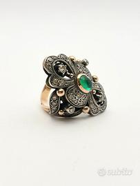 Anello in oro giallo 18KT (750 ‰) e argento di grammi 12.77 impreziosito da smeraldo naturale taglio cabochon e diamanti naturali forma tonda e taglio antico, epoca 1950.