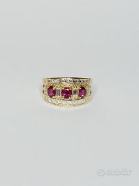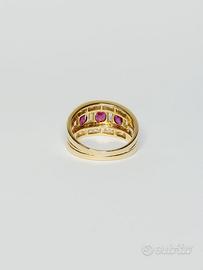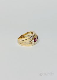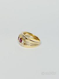 Anello in oro 18 kt ( 750 ‰ ) di grammi 6.90 impreziosito da rubini naturali taglio sfaccettato per ct. 1.20 ca totali, da diamanti naturali taglio carrè per ct. 1.00 e taglio baguette per ct. 0.60 purezza VVS colore G.