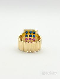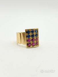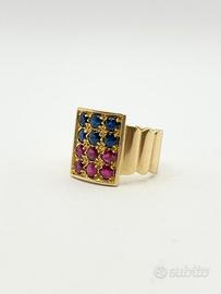 Anello in oro giallo 18KT ( 750 ‰ ) di grammi 8.98 impreziosito da rubini e zaffiri naturali forma tonda e taglio sfaccettato, epoca 1970.