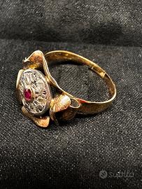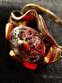 Anello in oro giallo 18kt con un rubino e sei diamanti taglio “rosetta”