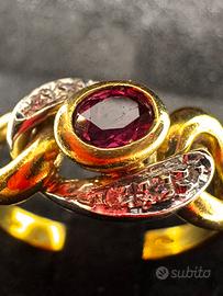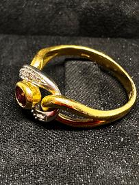 Anello in oro giallo e bianco 18kt con rubino naturale e sei piccoli diamanti taglio huit-huit.