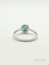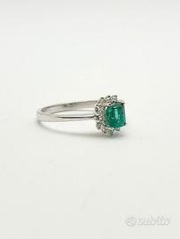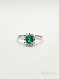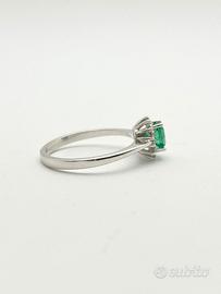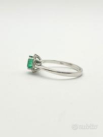 Anello in oro bianco 18KT ( 750‰ ) di grammi 2.60 impreziosito da smeraldo naturale taglio sfaccettato di ct 0.62 e diamanti naturali forma tonda e taglio a brillante di ct 0.13 totali; purezza VVS colore G.