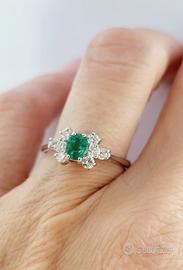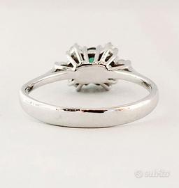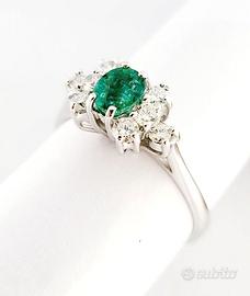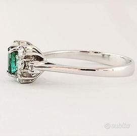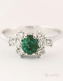 Anello Donna con Smeraldo Ovale ct 0,45 e Diamanti bianchi taglio brillante ct 0,32 lavorato in Oro Bianco 18kt-750 - Grammi 3,40