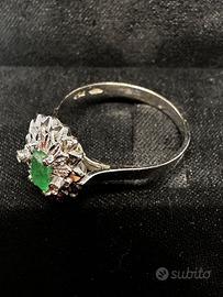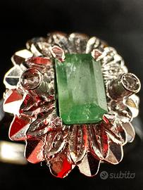Anello in oro bianco 18kt con smeraldo natirale di stimati 0,35 carati e due piccoli diamanti taglio huit-huit.