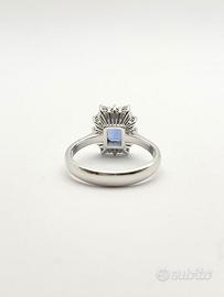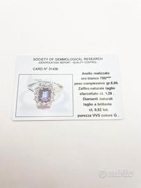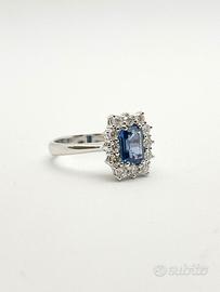 Anello in oro bianco 18 KT ( 750 ‰ ) di grammi 5.00 impreziosito da zaffiro naturale taglio sfaccettato di ct 1.20 e diamanti naturali forma tonda e taglio a brillante di ct 0.52 totali; purezza VVS colore G.