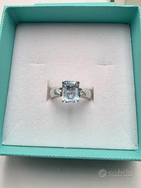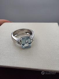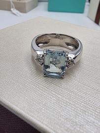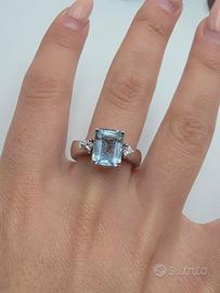 Stupendo anello in oro bianco massiccio 18 carati con una bellissima acquamarina naturale taglio rettangolare di 2 carati e due diamanti naturali taglio brillante 0,15 carati totali.