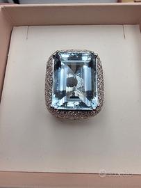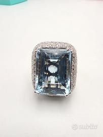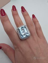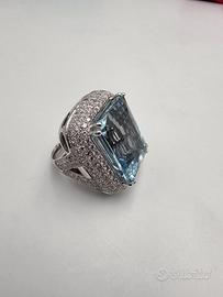 Splendido anello a fascione in oro bianco 18 carati con una meravigliosa acqua marina centrale taglio rettangolare da ben 27 carati e pavé di diamanti naturali taglio brillante intorno di 3 carati totali.