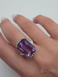 Bellissimo anello in oro bianco 18 carati con un suggestivo ametista centrale naturale di taglio rettangolare di 12 carati e 10 diamanti naturali di taglio brillante intorno di 0,10 carati totali.