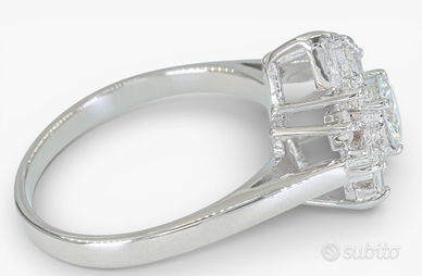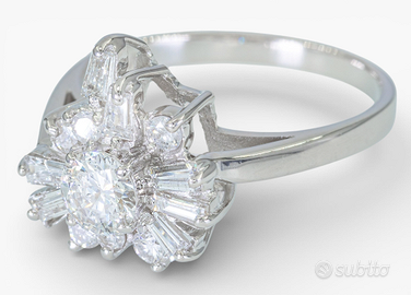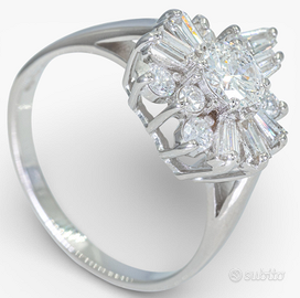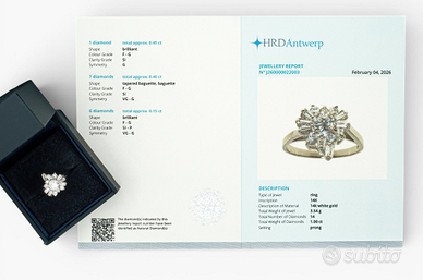 Scopri l'eleganza senza tempo di questo raffinato anello in oro bianco, arricchito da un scintillante assortimento di diamanti di qualità, un pezzo davvero unico per chi cerca un design sofisticato. -Diamanti: Questo anello è impreziosito da ben 14 diamanti, con una caratura totale di 1.00 ct. Un diamante centrale da 0.45 ct con taglio brillante e colori F-G (eccellente trasparenza) e chiarezza SI, incastonato in una montatura a griffe che ne esalta la bellezza. 7 diamanti baguette (0.40 ct totali) con colori F-G e chiarezza SI, disposti con simmetria VG-G per un effetto luminoso. 6 diamanti brillanti (0.15 ct totali), di piccole dimensioni ma dal grande impatto visivo, donano ulteriore brillantezza, con colori F-G e chiarezza SI-P. -Certificato HRD: Ogni diamante di questo anello è accompagnato dal prestigioso certificato HRD, una garanzia di qualità. -Peso totale: 3.54 g - Questo anello è nuovo e viene fornito con la sua scatola originale, pronto per essere indossato o regalato. La sua raffinatezza, la qualità dei materiali e la bellezza dei diamanti lo rendono un investimento ideale per chi desidera un gioiello elegante e senza tempo. Dettagli Epoca Dopo il 2000 Metallo Oro bianco Peso totale 3.54 g Condizione Come nuovo - mai usata Certificazione HRD Antwerp Numero di perizia di laboratorio J260000022003 Scala di colore del diamante F Gioielli di marca No Total carat weight of all stones 1 Pietra principale Diamante Tipo di diamante Naturale Numero di diamanti 14 Peso della pietra principale (in carati) 0.45 Grado di purezza del diamante SI1 Forma Rotondo Stile di taglio Taglio brillante Genere Donna Informazioni aggiuntive sul titolo HRD Taglia dell’anello 55 (EU) / 15 (IT) / 7 ¼ (US) (Prezzo leggermente trattabile)