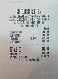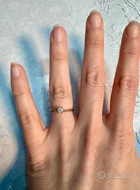 Anello oro bianco con diamante (solitario) •Oro 750 (18 kt) peso 2,05 g •Diamante 0,15 ct Misura nr.9 (US 49) modificabile in gioielleria. Prezzo pieno 640 euro. A Malalbergo (BO).