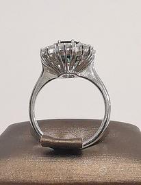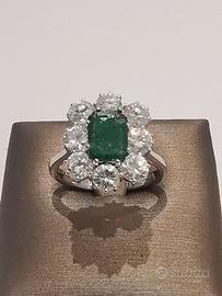 Anello con montatura in oro bianco 18 carati (750/1000), con smeraldo centrale naturale dello Zambia di circa 1,17 carati, nel classico taglio smeraldo con trattamento all’olio moderato e contorno di diamanti naturali taglio brillante di circa 1,60 carati, colore H-J, purezza VS1-VS2.