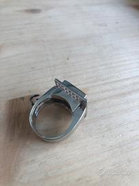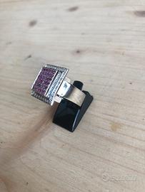 Importante anello tempestato di piccoli rubini per un totale di 36 da circa 2 punti cad. circondati di diamantini n. 32 per un totale di ct. 0.40, per un peso di gr. 18 marca D&D. Gioielli