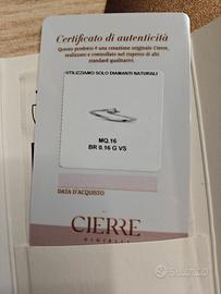 Come da titolo vendo, praticamente nuovo (proposta di matrimonio ovviamente non andata a buon fine), anello in oro bianco e diamante. Presente certificato di autenticità. Dettagli in foto.
