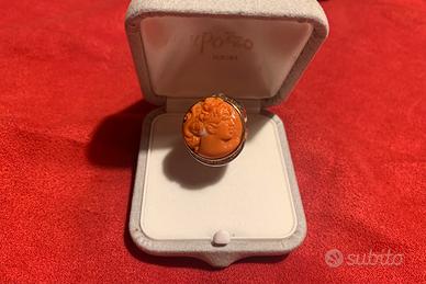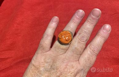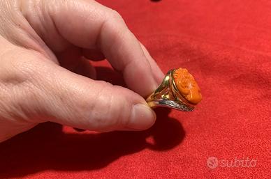 Splendido anello oro giallo con cameo in corallo attorniato da brillanti. Misura 14.00. Consegna solo s mano, di persona.