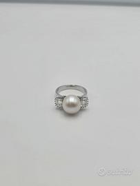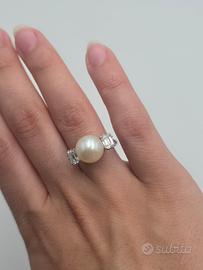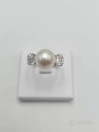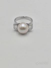 Anello in massiccio oro bianco massiccio 18 carati con la perla centrale Akoya dal Giappone 10,5 millimetri di diametro e due diamanti complessivi intorno taglio navette 0,75 carati totali.
