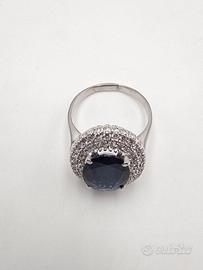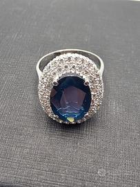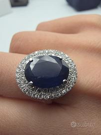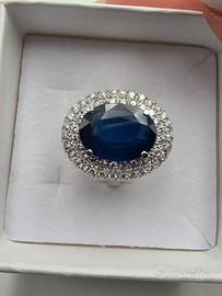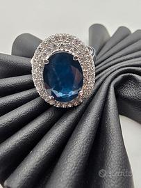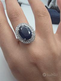 Bellissimo anello di Valenza realizzato in oro massiccio bianco 18 carati con pavé impreziosito da 60 diamanti taglio brillante per totale caratura 0.90ct e zaffiro centrale da 4.26 carati taglio ovale.