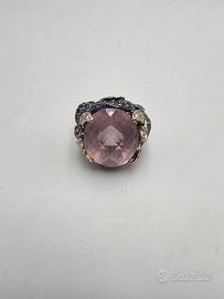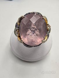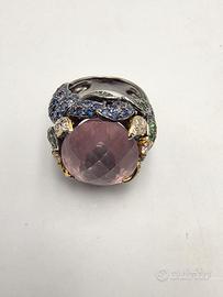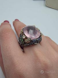 Bellissimo anello artigianale in oro brunito 18 carati con un quarzo rosa naturale centrale di caratura importante, petali e foglie intorno tempestati da 30 diamanti naturali, 140 zaffiri naturali e 78 smeraldi naturali.