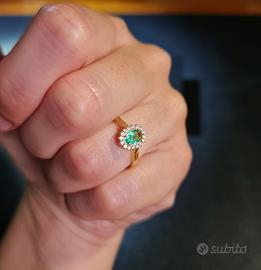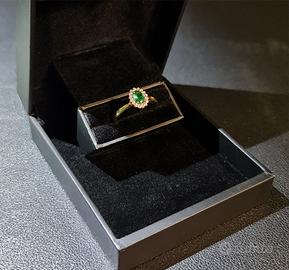 Splendido anello realizzato in oro giallo 14 kt (585/1000), impreziosito da uno smeraldo naturale da 0,80 ct e da un raffinato contorno di diamanti per un totale di 0,18 ct. Un gioiello dal design classico e senza tempo, ideale per chi ama la bellezza intramontabile delle pietre preziose.