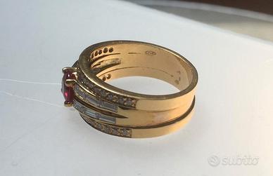 Anello oro giallo 18 kt di con 1 rubino naturale taglio ovale di carati stimati 0,70. Attorno 34 diamanti taglio brillante di ct stimati 0,38 e 12 diamanti taglio baguette carati (stimati) 0,70. Peso totale grammi 10,80. Condizioni eccellenti usato raramente, direi privo di segni visibili di usura. Acquistato dai miei genitori, non ho trovato il certificato della gioielleria di provenienza, ma ho incaricato di una perizia una gioielleria che ha redatto un Certificato di Autenticità e una descrizione accurata dell'oggetto, che fornirò in originale firmato all'acquirente.