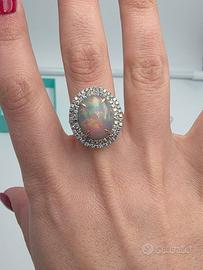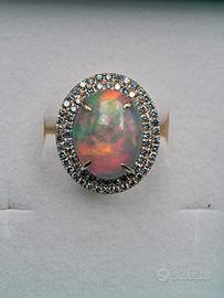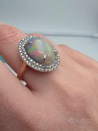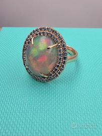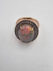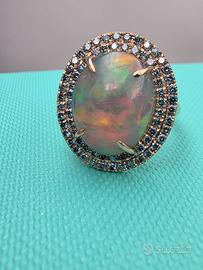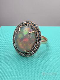 Stupendo anello di nostra realizzazione in particolare montatura in oro rosa massiccio 18 carati con un particolarissimo e naturale opale arlecchino ovale cabochon di 5,15 carati e 115 naturali diamanti blu intorno.