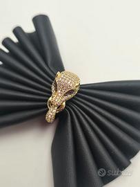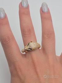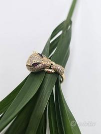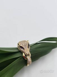 Splendido anello a pantera in oro giallo massiccio 18 carati con pavé di brillantini, pietre nere e rosse a segnarne gli occhi.