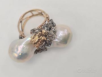 Bellissimo anello lavorazione artigianale in oro massiccio AU585 contrarié con 30 diamanti naturali taglio brillante e due bellissime perle barocche.