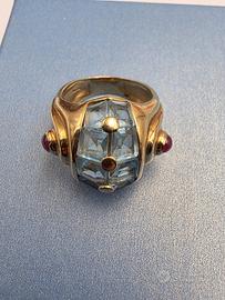 Bellissimo anello in oro giallo 18 carati, con imponenti 10 acquemarine di taglio quadrato e 2 rubini naturali taglio cabocon ai lati.