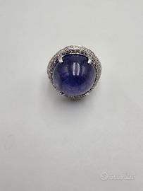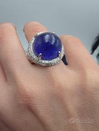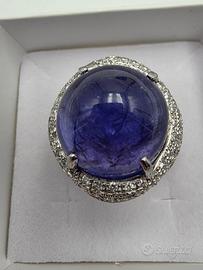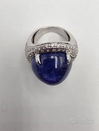 Particolarissimo anello in oro bianco massiccio 18 carati con vera tanzanite centrale taglio cabochon di ben 17 carati e diamanti naturali di taglio brillante di 1,30 carati totali. Un cielo stellato tutto sul dito di una mano.