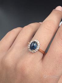 Stupendo anello in stile Pomellato in oro rosa massiccio 18 carati con zaffiro naturale centrale taglio cabochon di 0,75 carati e 16 diamanti naturali taglio brillante intorno a fiore di 0,46 carati totali.