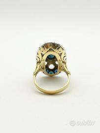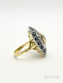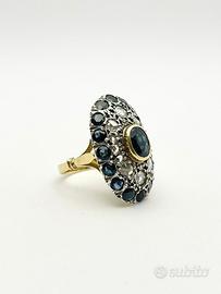 Anello in oro bianco e giallo 18KT (750 ‰) di grammi 9.38 impreziosito da diamanti naturali forma tonda e taglio antico e zaffiri naturali taglio sfaccettato, epoca 1950.
