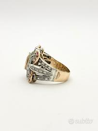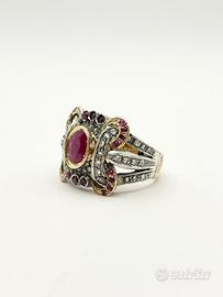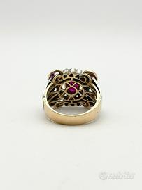 Anello in oro bianco e giallo 18KT (750 ‰) di grammi 7.39 impreziosito da diamanti naturali forma tonda e taglio antico e rubini naturali taglio sfaccettato, epoca 1950.