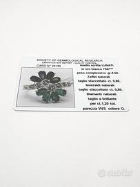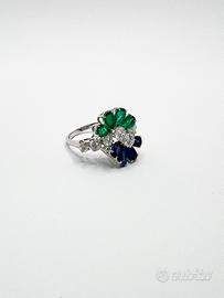 Anello in oro bianco 18 KT ( 750 ‰ ) di grammi 5.50, con diamanti naturali taglio a brillante per ct 1.20; purezza VVS colore G, zaffiri naturali taglio sfaccettato per ct 0.80 e smeraldi naturali taglio sfaccettato per ct 0.80, scritta LUNATI.