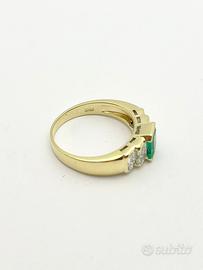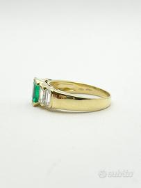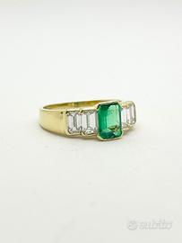 Anello in oro giallo 18KT (750 ‰) di grammi 5.30 impreziosito da smeraldo naturale colombiano taglio sfaccettato di ct 1.30 e da diamanti naturali taglio a "smeraldo" di ct 0.80 totali; purezza VVS colore G. Firmato DAMIANI.