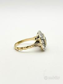 Anello in oro bianco e giallo 18KT (750 ‰) di grammi 5.05 impreziosito da diamanti naturali forma tonda e taglio antico e zaffiri naturali taglio sfaccettato, epoca 1940.