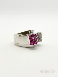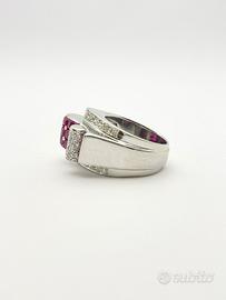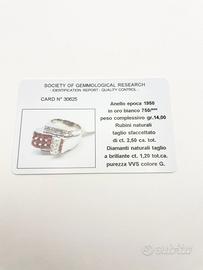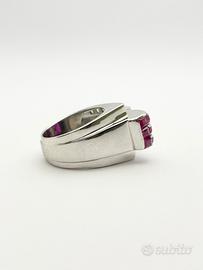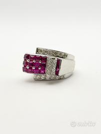 Anello in oro bianco 18KT ( 750 ‰ ) di grammi 14.00 impreziosito da rubini naturali taglio sfaccettato di ct 2.50 totali e da diamanti naturali forma tonda e taglio a brillante di ct 1.20 totali; purezza VVS colore G. Epoca 1950.