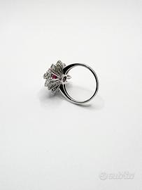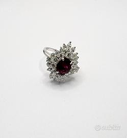 Anello in oro bianco 18 KT ( 750 ‰ ) di grammi 7.90, con diamanti naturali taglio a brillante e navette per ct 2.80; purezza VVS colore G e rubino naturale taglio sfaccettato di ct 2.70.