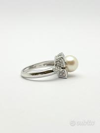 Anello in oro bianco 18 KT ( 750 ‰ ) di grammi 7.80 impreziosito da perla coltivata Giappone di mm 8.50 e diamanti naturali forma tonda e taglio a brillante di ct 0.80 totali; purezza VVS colore G. Scritta DAMIANI.