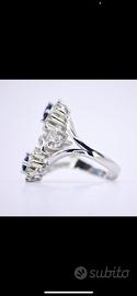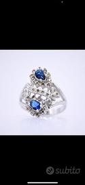 Vendo splendido anello in platino, nuovo e mai indossato, perfetta fusione tra classico e moderno. Un gioiello dal design raffinato, impreziosito da diamanti naturali e due quarzi blu a forma di pera, che donano luce e carattere unico al pezzo.