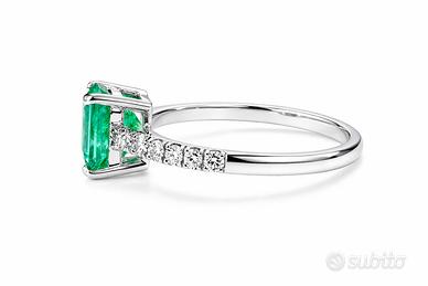 Elegante anello con smeraldo naturale colombiano da 2.55 carati, montato su oro bianco 18 carati (750) e impreziosito da diamanti naturali per un totale di 0.20 carati incastonati sul gambo.