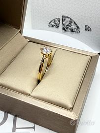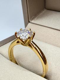 Elegante anello modello Tiffany in argento 925 placcato oro giallo, con diamante moissanite da 1 carato incastonato a sei griffe, per una luminosità eccezionale e uno stile senza tempo.