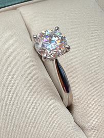 Un classico intramontabile: il nostro anello solitario a quattro griffe, impreziosito da una Moissanite da 1 carato incastonata con precisione, colore brillante e purezza VVS1, cattura ogni raggio di luce e riflette un’eleganza senza tempo.
