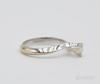 Anello solitario Gianni Carità in oro bianco 18 carati, con un brillante diamante da 0,20 carati (colore G, purezza SI). La misura 12,5 è regolabile su richiesta, offrendo una vestibilità personalizzata. Un gioiello sofisticato che incarna la semplicità e la luminosità senza tempo.