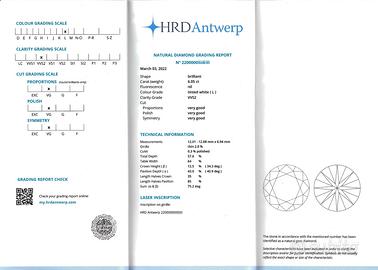 Bellissimo anello in oro bianco 18 carati (750/000), misura 16 (56), dal peso totale di 5,8 grammi, impreziosito da diamanti rotondi taglio brillante per un totale di 6,05 carati. Le gemme, di colore L e purezza eccezionale VVS2, offrono una brillantezza luminosa e raffinata. L’anello è corredato da certificato internazionale HRD, garanzia di autenticità e qualità gemmologica. Elegante e di grande impatto visivo, è un gioiello di alta classe. Può essere messo a misura senza intaccarne le caratteristiche estetiche, garantendo una vestibilità perfetta.