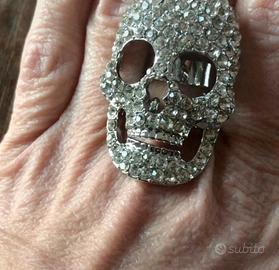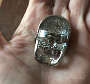 Anello teschio in metallo argento con Swarovski, condizioni eccellenti, taglia unica. La parte inferiore della bocca si muove con il movimento della mano.