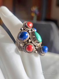 Splendido anello etnico artiqianale (stile Tibet/Nepal) in argento sterling punzonato 925. ll gioiello presenta una ricca lavorazione in filigrana e granulazione, impreziosito da pietre naturali (tipiche della tradizione himalayana) incastonate: un turchese centrale a goccia, lapisazzuli blu e inserti in corallo rosso.