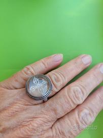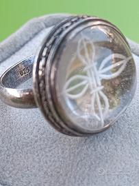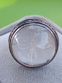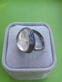 Anello in argento lavorato . Centrale in vetro con incisa la croce tibetana o vajra, simbolo di forza e verità.